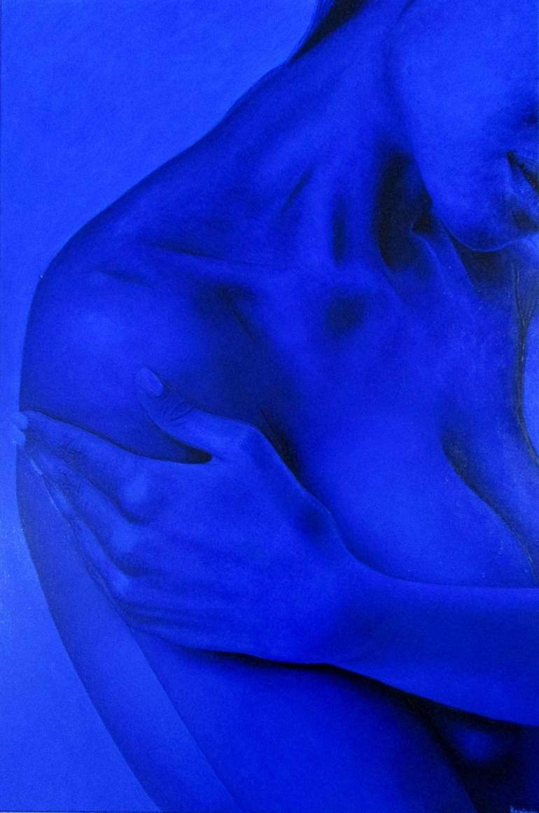The painting shows a woman who blends in with the background - pure cobalt blue. The idea was to combine woman beauty with a deep, pure and mesmerizing shade of blue. Inspiration was the work of the artist Yves Klein. The image is filled with harmony and peace. Mood is mysterious and ephemeral. I u...