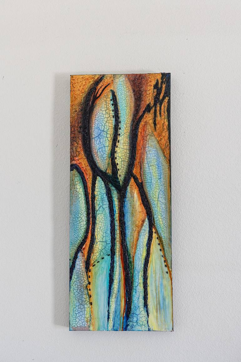 I paint intuitively, finding structures and patterns in the layers I create. I enjoy using texture and embellishments in my paintings. In this painting, I applied crackle paste and modeling medium to the canvas and layered orange, blue and yellow hues over the texture. This painting is embellished w...