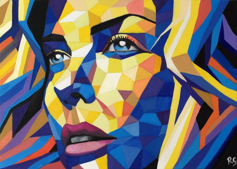 This painting is an important piece of the “Blue and Yellow” collection because of the brightness of its colors. It is a modern, full of energy and bright painting. A beautiful and delicate face of a woman with her hair down fills the entire canvas. It is painted combining different tones of yello...
