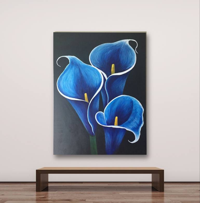 Short and Sweet: "This vibrant and eye-catching painting of blue calla lilies is sure to brighten up any space. The rich colors and bold design are perfect for a modern or contemporary home. Detailed and Descriptive: "This stunning painting captures the beauty of three blue calla lilies against a da...