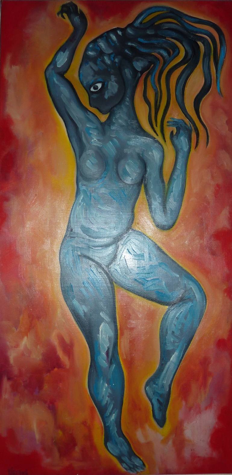 La danseuse bleue ; la flamme qui danse, ondule au bout d'une allumette. Oil on canvas