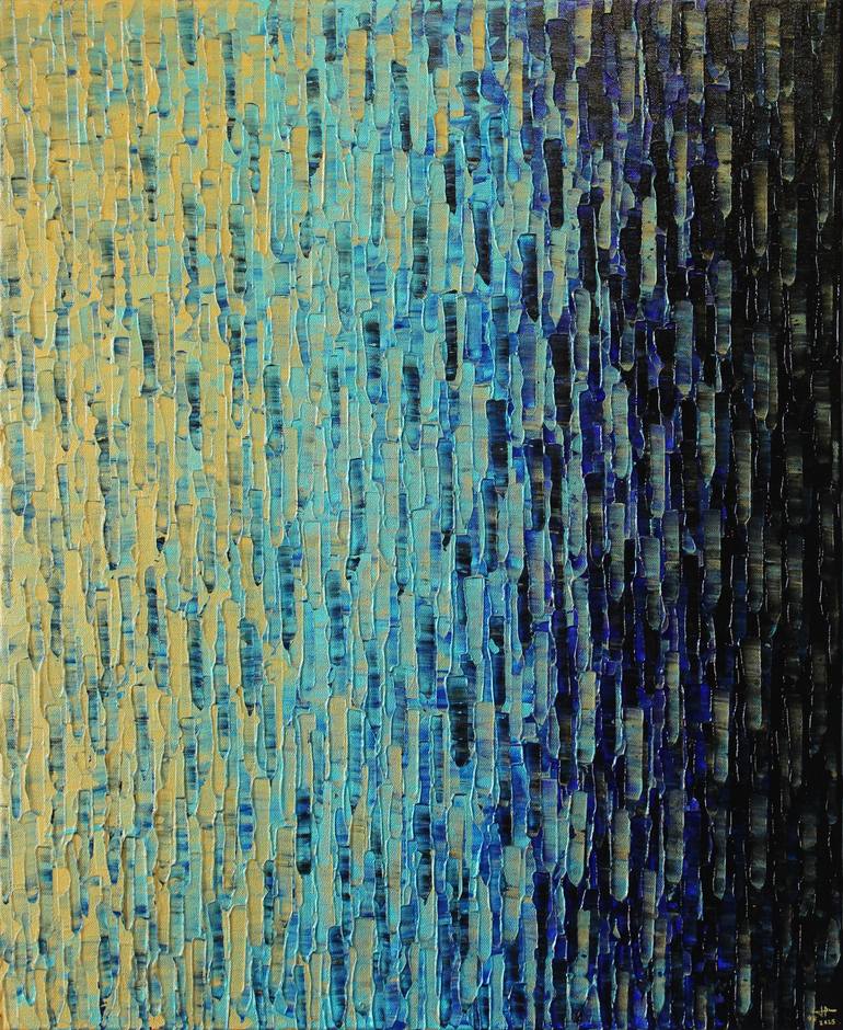 Iridescent Painting | Gold Blue Gradient Original artwork created with a palette knife and acrylic paint on 100% cotton canvas, stretched over a wooden frame. Features iridescent colors that reveal subtle shifts under the light. The edges are painted black in acrylic for a clean, contemporary prese...