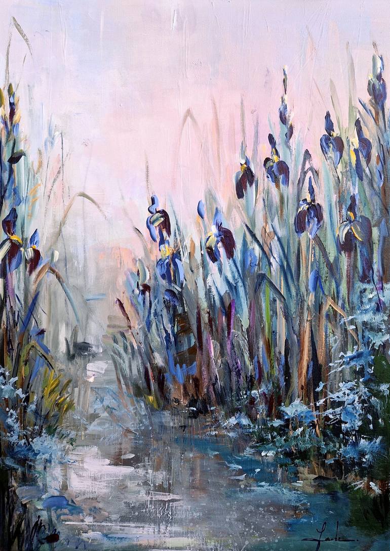 Blue irises painting, acrylic on canvas, 50x70 cm; Finished with varnish including UV protection.