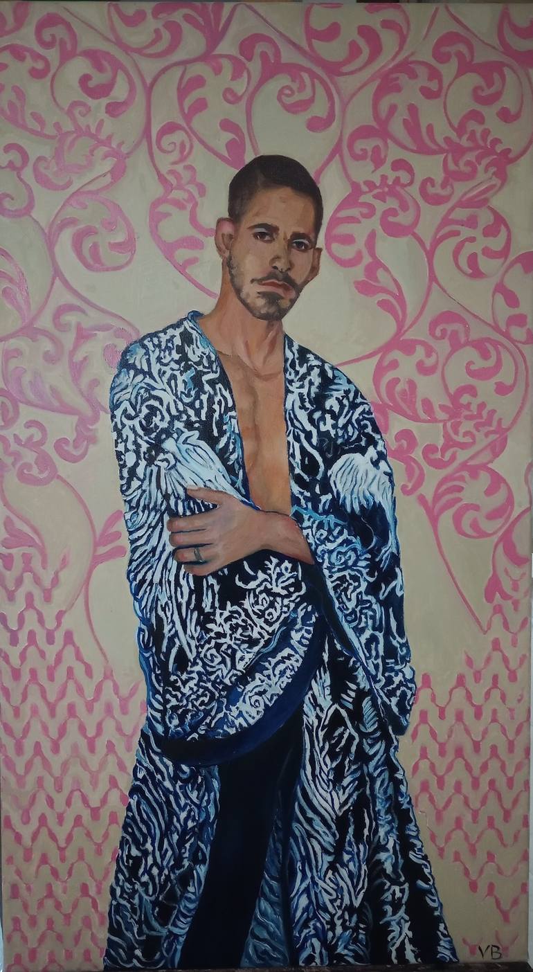 Immerse yourself in the captivating allure of "Blue Robe," a stunning oil portrait that seamlessly blends figurative art with modernism. The artist's masterful technique brings the subject to life on canvas, showcasing a rich tapestry of color and texture. The detailed blue robe and background creat...