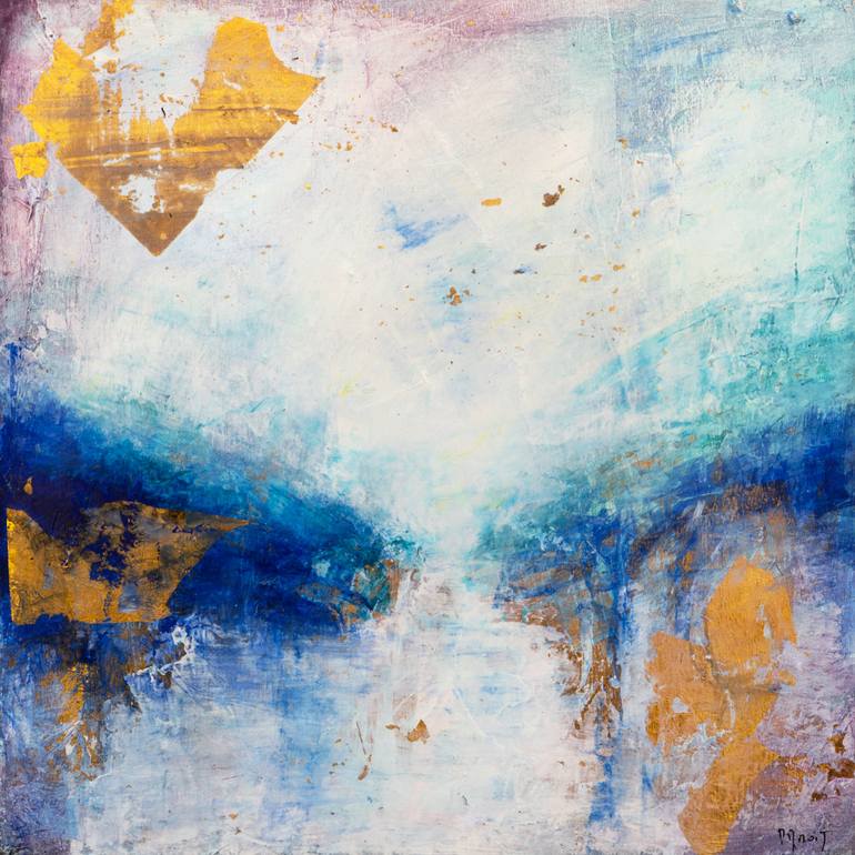 Here Ode always leads us into the light using fluid blues symbolizing water, air, distant vapors absorbed in a sky of light, the flickering of the gold leaf gives a mystical side to the work, the valley blue opens towards a space where the sky and the water merge into the light here no more limit, n...