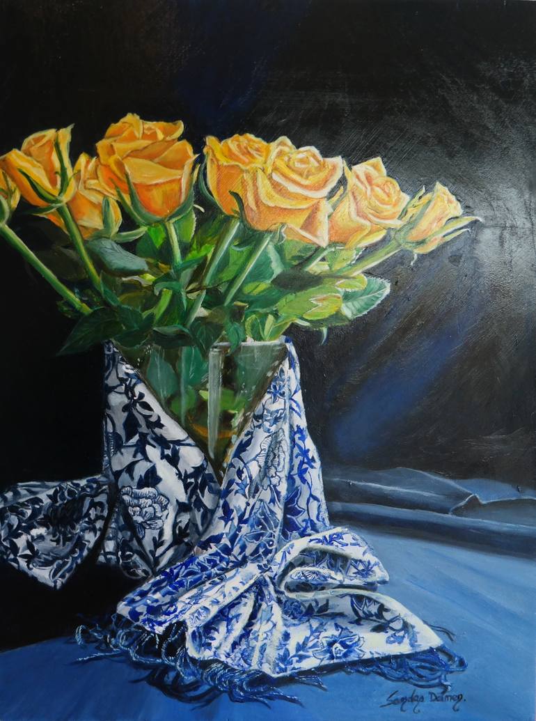 I received this Chinese scarf from a Chinese old colleague for my birthday. Very nice silk scarf. I was also very happy with it. so I thought, buy some nice yellow roses, put them in a vase, a blue velvet cloth in the background and that nice silk scarf around the vase. This is how I painted this s...