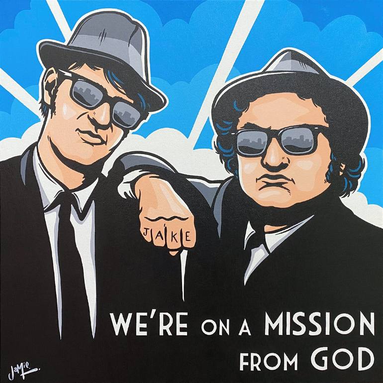 Comic book style pop art painting of Jake and Elwood Blues - 'The Blues Brothers', with their quote from the iconic movie "We're on a mission from God". We see Dan Ackroyd and John Belushi in their roles as the brothers. Professional quality acrylics on stretched canvas. The sides are painted black ...