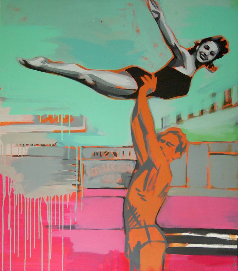 Paintings and drawings inspired by retro advertising and fashion magazines from the 50s and 60s. Skillful figurative subjects are splashed against abstract backgrounds. Looks of classic seduction and old time glamour stare at the viewer from within a lively backdrop populated by color blocks, drips, dots and lines. In 2000 Tracy set up her art studio in Asia where she lives in Bali, Indonesia with her dog Ramona. or for more work check out