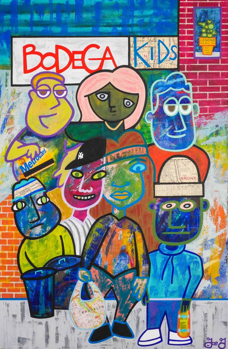These original characters are inspired by the variety of people and bodegas in New York. This painting represents a group of people who grow together and thrive in their environment despite their diverse backgrounds. Using maps and MTA subway cards, this mixed media painting is an attempt to illustr...