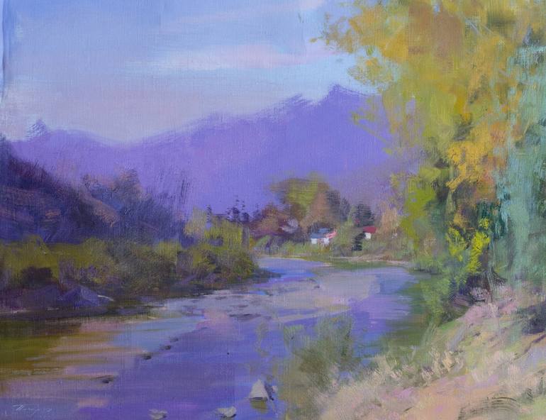 This captivating oil painting exudes the warmth and vibrancy of an autumnal landscape bathed in golden light. The dynamic composition features a flowing mountain river in the foreground, its shimmering surface reflecting hints of amber, gold, and soft blue tones. The river is flanked by trees in ful...
