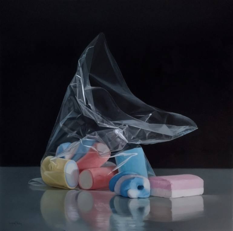 Una obra donde se ve un conjunto de dulces en una bolsa, algunos de ellos fuera de la bolsa. La luz que envuelve el modelo destaca sobre un fondo oscuro neutro.