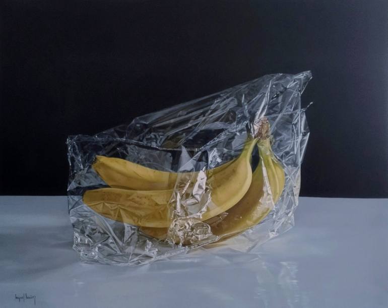 On a white table, a plastic bag with bananas on a black background. The brightness of the bag and the yellow of the fruit stand out.