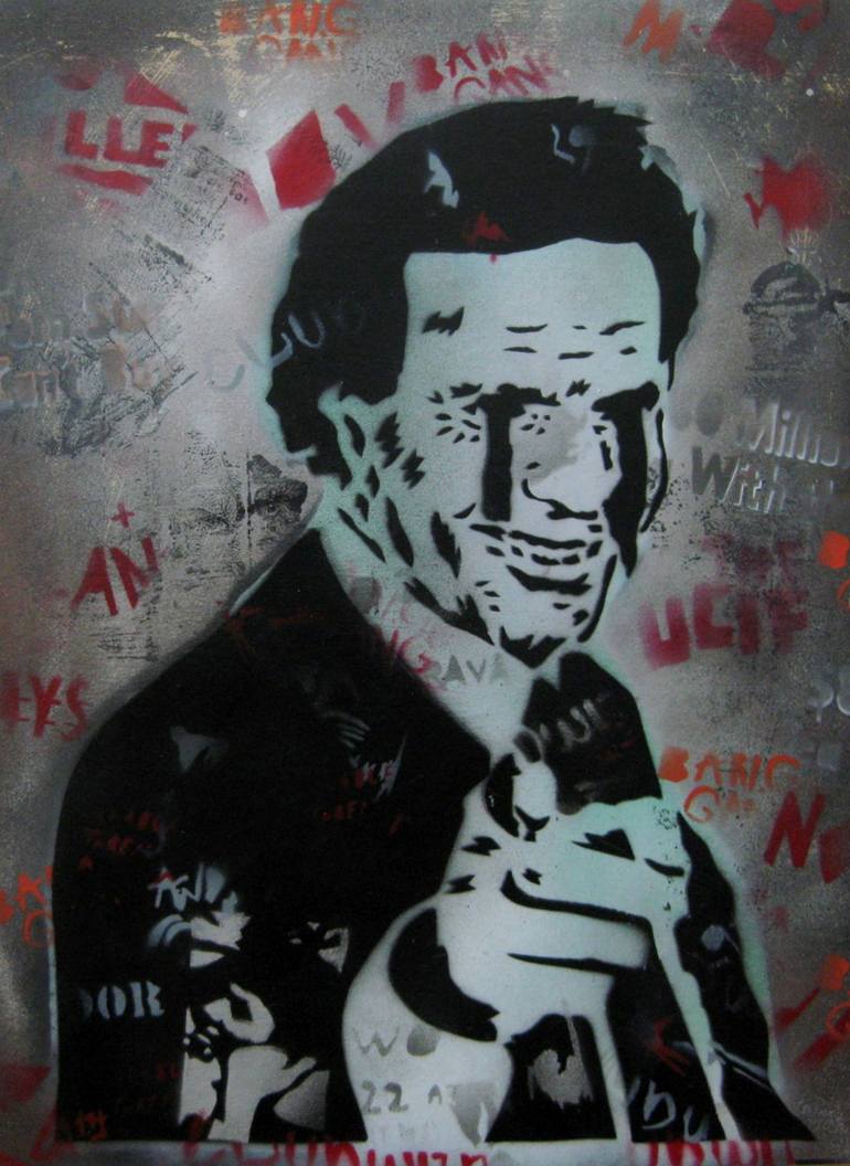 Intervened representation of Spanish singer and songwriter Julio Iglesias. Unique artwork made with manual and experimental printing techniques. Includes textures and corrosion effects using sprays and acrylic paint on recycled gray cardboard in good condition. It measures: 55 x 42 centimeters. Unf...