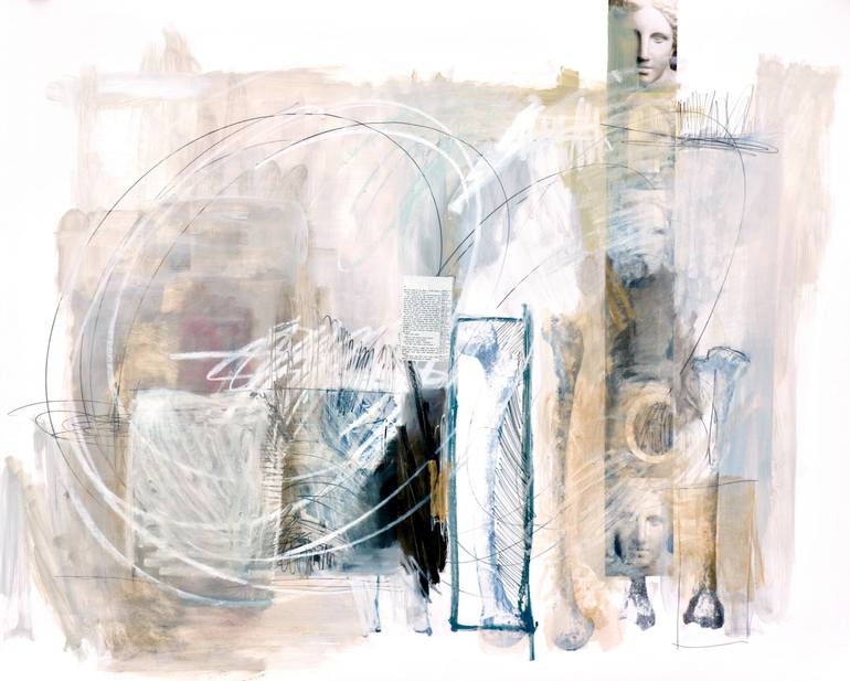 I bring together seemingly disparate elements, finding narrative balance where chaos and movement meet stillness and calm, creating harmony in the final composition. I engage the viewer’s curiosity and desire to experience these intersecting layers of form and expression, where they discover a place of beauty and ultimately, relief. Jayne Biehn (b.1964) is a California-based creator of mixed media works integrating printed paper, acrylic, oil stick, staples and graphite.