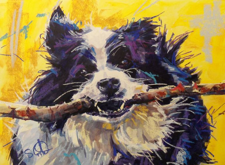 A border collie carrying a stick in its teeth with a yellow background