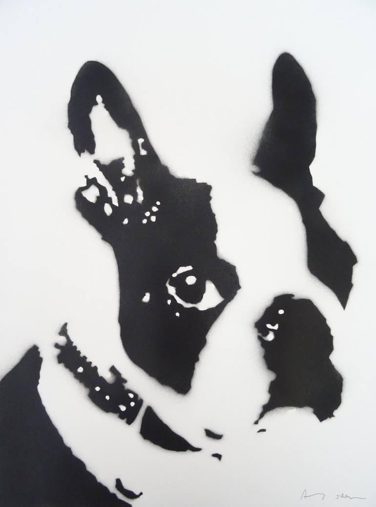 Boston Terrier. Spray Paint on paper 2021. Signed by Andy Shaw. Ready for framing.