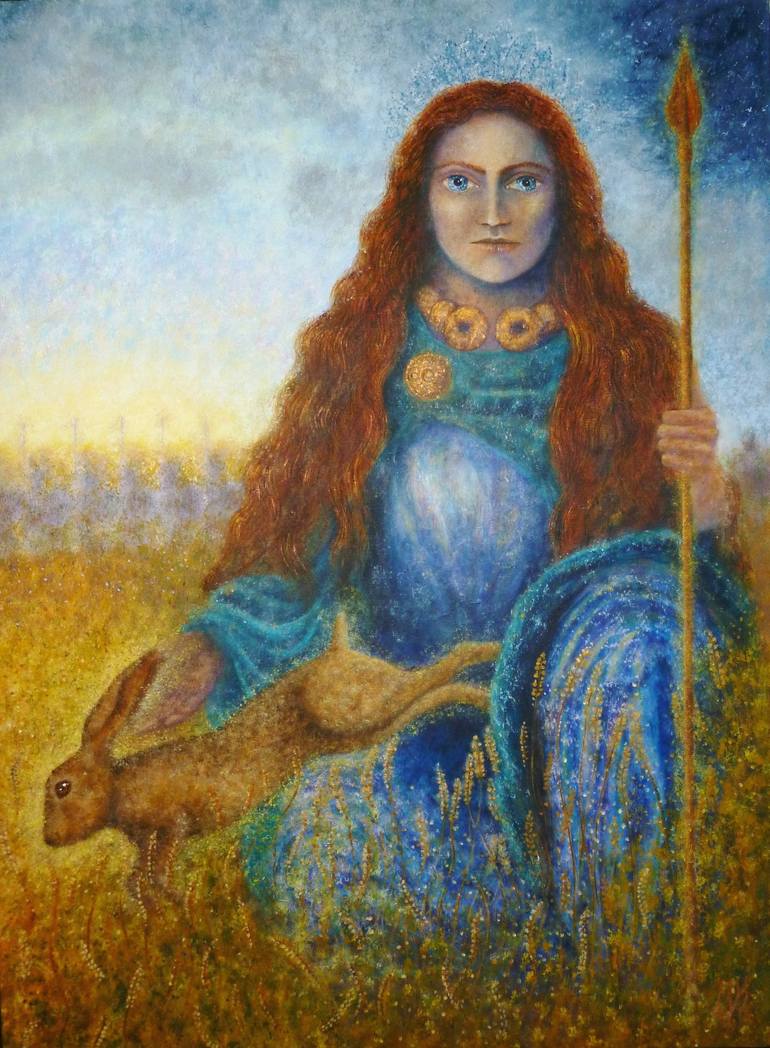 This painting took about 100 hours to complete and is part of a series I am working on about our own cultural history and spiritual roots. The story of Boudicca, as described by a Roman onlooker Tacitus, tells that she released a hare from the folds of her cloak in an act of divination before a gre...
