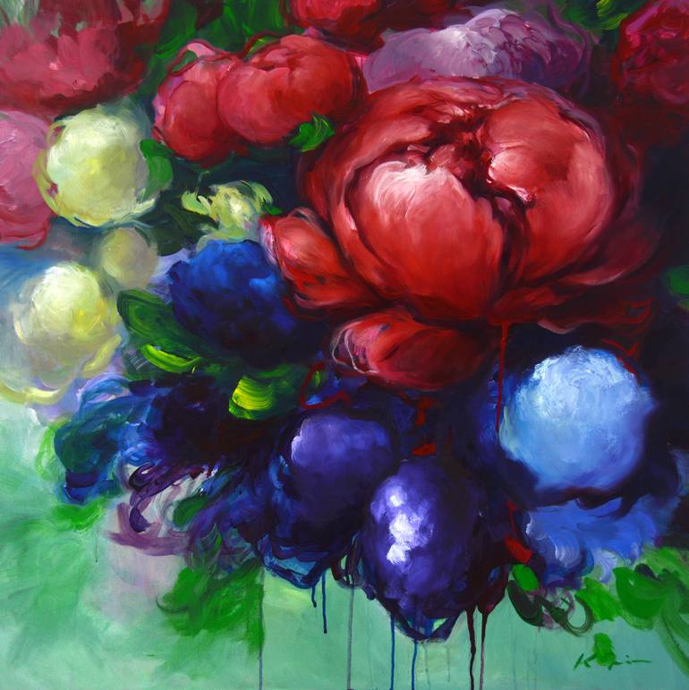 *Title: Bouquet I *Size: 36 (height) x 36(width) x 1.8 (depth) inches (Upon request I can paint similar design in other sizes and colors. Please, contact me) *Materials: Acrylic paint on wrapped cotton canvas *Style: Abstract, Modern, Contemporary *Finish: Gloss varnished for long lasting protection...