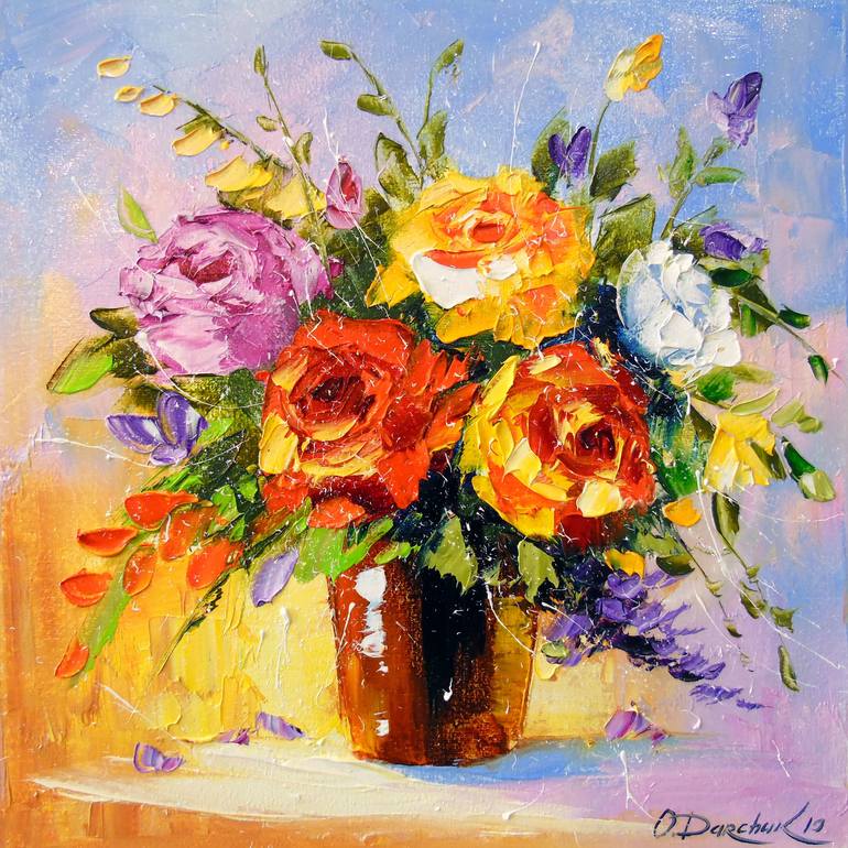 Bouquet of roses oil painting, unframed as the edges are painted 100 % handmade palette knife and high quality oil, for interior or as a gift. Decorate your interior and for a long time will give joy to you and your family. Ready to hang.