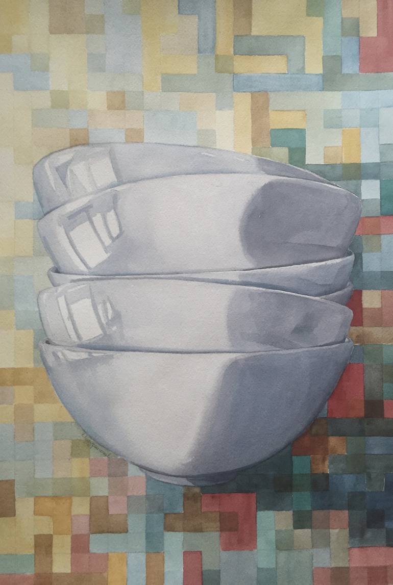 This one is part of a series of plain, white bowls, painted with different backgrounds. The idea was to play with colour combinations completely unrelated to reality. Colours may vary according to the monitor.