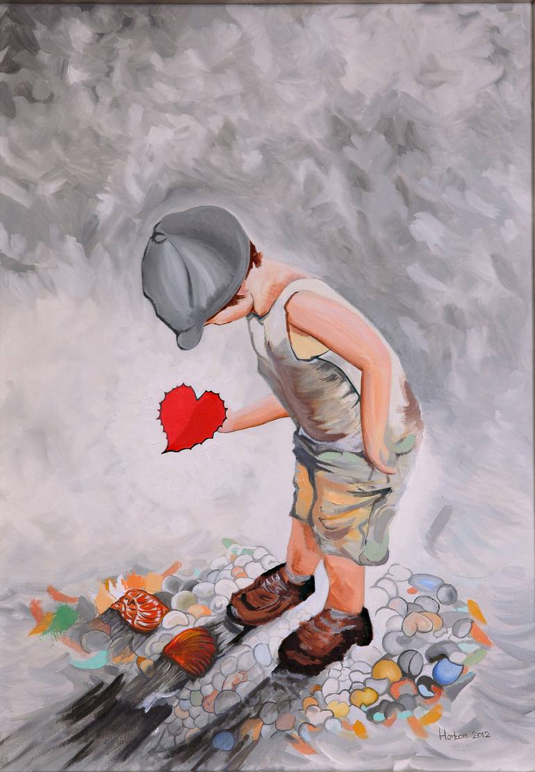 I was inspired to paint this piece when I was walking along the beach of my adopted home city of Brighton on the south coast of England. I saw the boy inquisitively pick up the heart shaped leaf & examine it. I hope the viewers will create their own narrative for this piece.