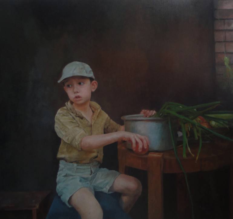 READY TO HANG ONE-OF-A-KIND *** Details: Name: "Boy with apples" * Artist: Radosveta Zhelyazkova * Medium: Professional oil paint, UV protected varnish on linen canvas * Size: 60 x 65 x 2 cm * Style: Realism/portrait * 100 % handmade artwork * Date of creation: May 2020 * Comes with a certificate of...