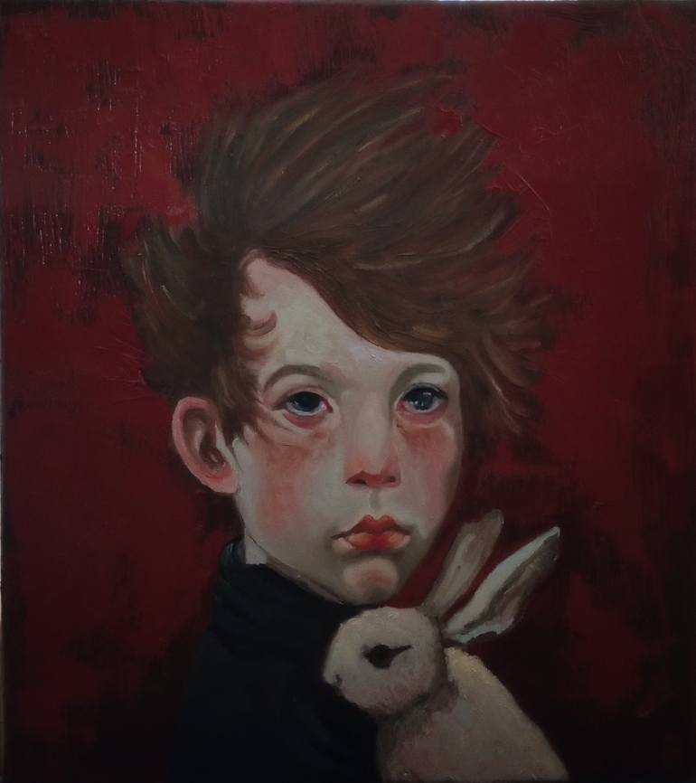boy/ oil/ canvas on cardboard, realism rabbit toy wind protective concerned