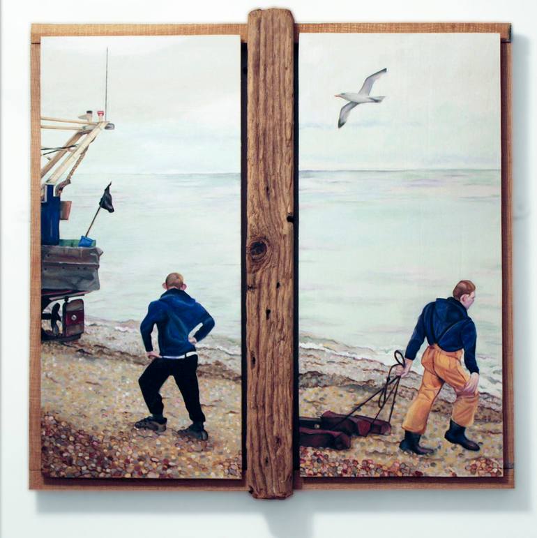 Hastings Beach, beach launched fishing fleet, early morning - diptych with oak frame and driftwood divider.