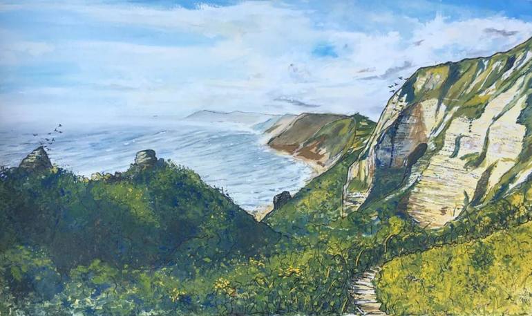 Gouache on paper of the stunning coast at Branscombe in Devon. The walk up from Branscombe Beach through Hooken Undercliff is very atmospheric with it's rock pinnacles and knot of vegetation, suggesting a lost Jurassic land. The rooks swirl up from the craggy cliffs, reminding me of their dinosaur a...
