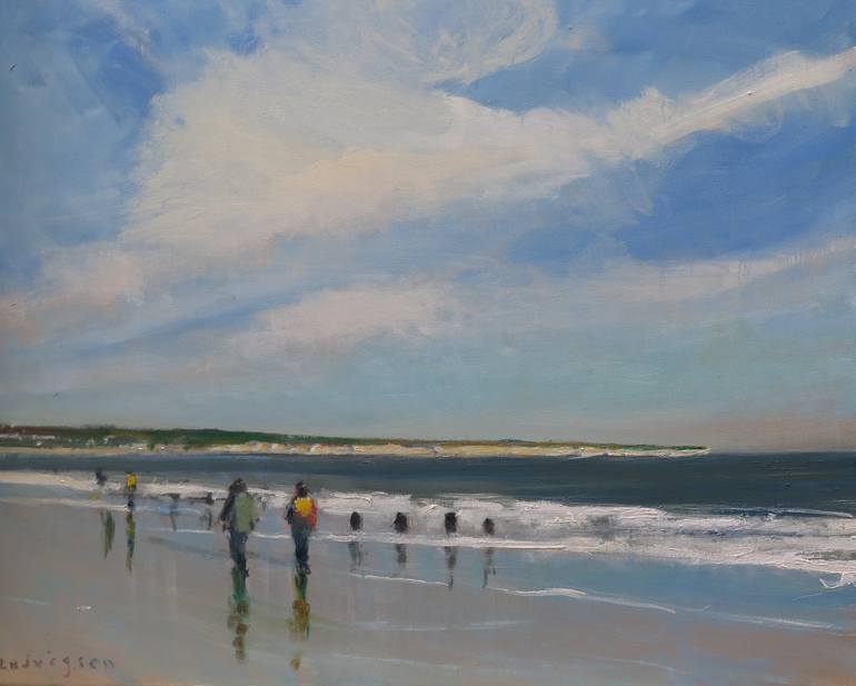 I painted this on the spot (they call it en plein-air) on Bridlington Beach (North) looking towards Flamborough Head and Sewerby. I was particularly attracted by the reflections of the figures and beach groins in the wet beach. It's 30x24'', oil on canvas. . In order to keep costs to a mi...