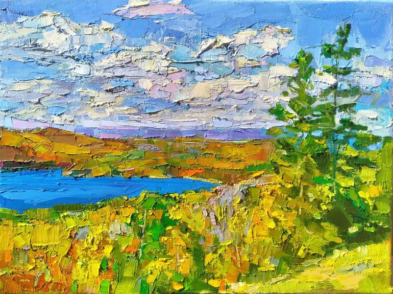 Original oil on canvas painting stretched on a wooden frame. Landscape painting in the impressionistic traditions. Pre-Appalachian landscape. Bright day. Impasto. Master-quality material has been used. Heavy impasto builds with brushes and pallet knives. Edges of the painting are covered with arc...
