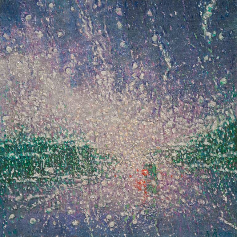 Rain falls on the windshield and spreads in a bright trajectory. Painted in layers and textured with thick and thin paint. This one in a series of "windshield paintings" is painterly, brushy, and slightly textured. It is painted on gallery wrapped linen over 1 1/2 inch deep stretchers, with color ma...