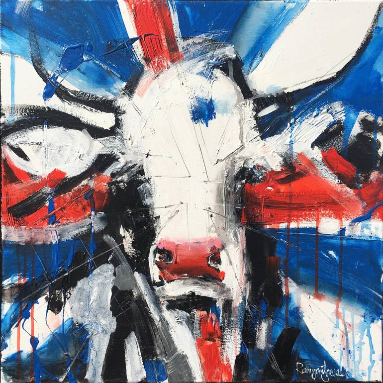 The Union Jack incorporated with the British cow. Expressive style of painting with thick textured acrylic paint strokes. 60cm x 60cm. 100% cotton canvas stretched over a deep 4cm wooden frame. No further framing required. All artworks come with a certificate of authenticity.