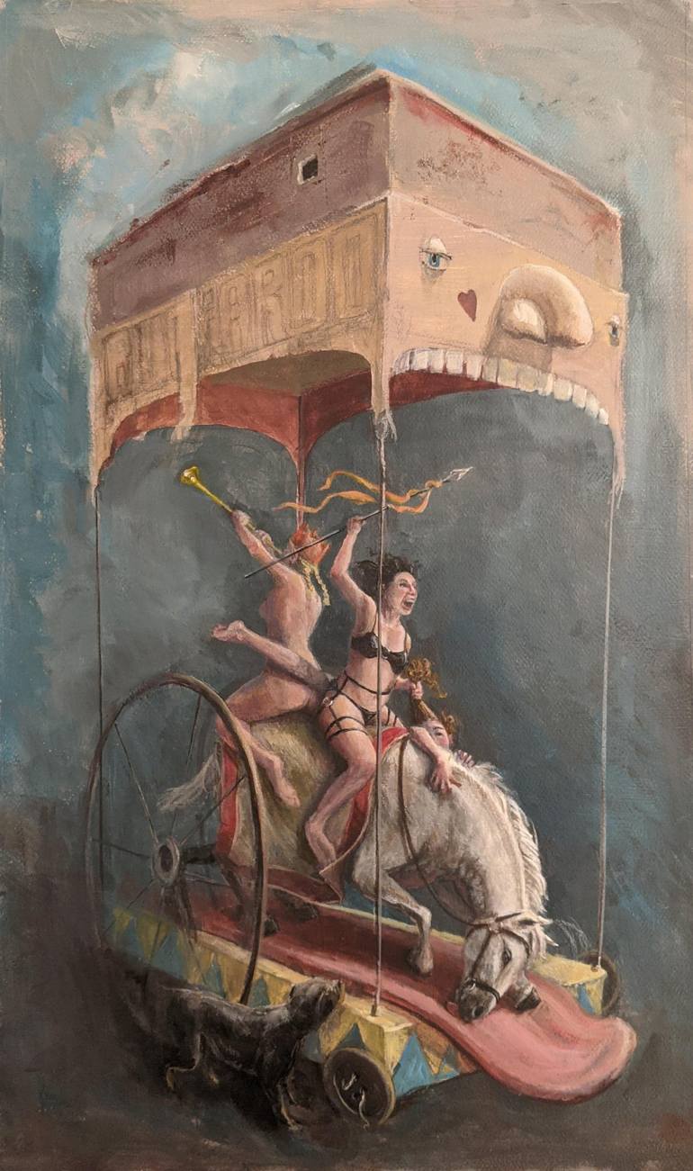These women are riding on the fairground of life. Grasping it by the horns. The layers of narrative allow for endless musings, fascination and discussion. but who is watching from the small window above the drama? Is this a part inside each of us? a silent witness that watches the whole parade from ...