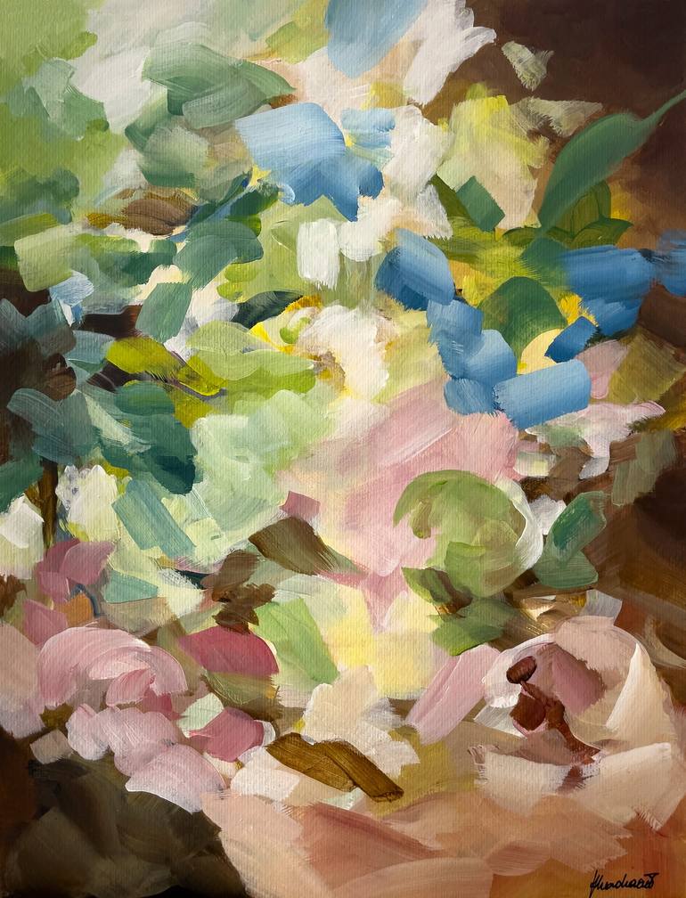 Work on Fabriano Fine art paper 400g, slightly textured. Work in acrylic paint representing an abstract landscape or an imaginary garden. The artist uses her memory and her feelings to transpose images of nature from her experience onto the canvas. She works with small brushstrokes in an intuitive a...