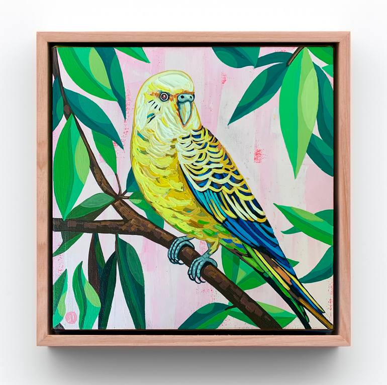 Acrylic on canvas, stretched and ready to hang. Signed on the back. This artwork comes with an external frame Created in special memory of my grandmother Rubinia - a remarkable woman who revelled in nature's beauty and held a special fondness for birds, particularly budgies. Her backyard sanctuar...