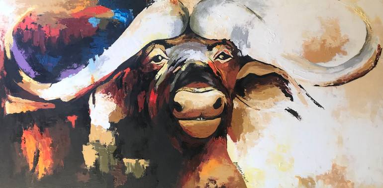 Bold strokes emphasize the animal’s strength and resilience, capturing its rugged presence in the wild. Inspired by the buffalo’s stoic majesty, the artwork reflects both its raw power and the untamed energy of the landscape surrounding it.