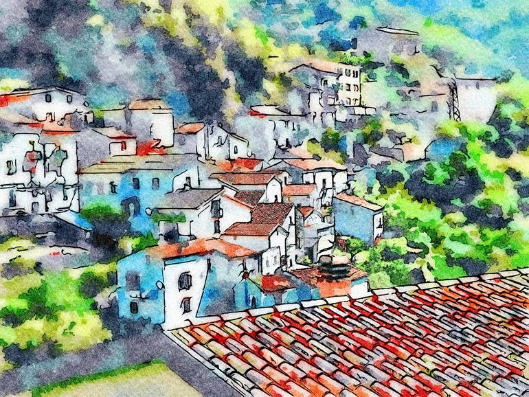 This watercolor is part of a series made with photographs taken during a trip to Calabria in 2014; this stage brought me from the Costa dei Cedri inside, on the Pollino mountains. Passing under Santa Domenica Talao, of curve in curve, up to Papasidero and the Paleolithic cave of the Bos Primigenius...