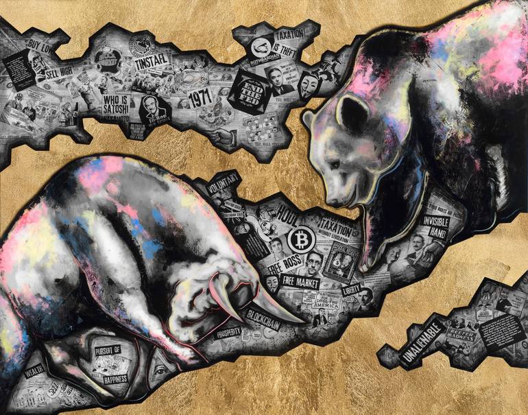 Bull and Bear, mixed media painting with gold leaf and free market themed collage in background. It explores Cryptocurrencies, fiat, and Austrian economics, popular with the liberty, classical liberal, libertarian and anarchocapitalist, voluntarist movements. **I recommend the canvas option for l...