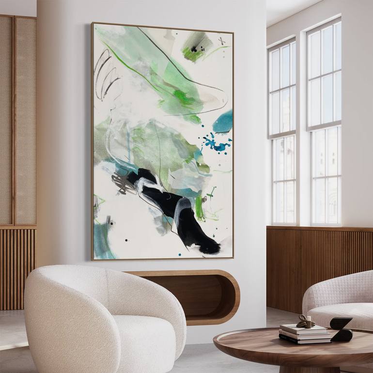 'Bump Track' is an original statement painting by Cheryl Harrison. This large painting has gestural marks in acrylic and pencil across the canvas surface. It's striking palette consists of predominantly a beautiful array of neutral blue and green tones. Areas of white and beige blend into pops of ...