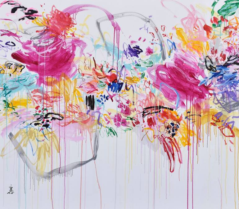 Title: Buoyantly Size: 140 x 160 cm Painting: Acrylic on Canvas Year Created: 2022 The image shown is the visible area after being framed. There is about 5 cm extra canvas (painted) on each side for stretching. *The very edges of the canvas were stapled on a board while painting, and those edges m...