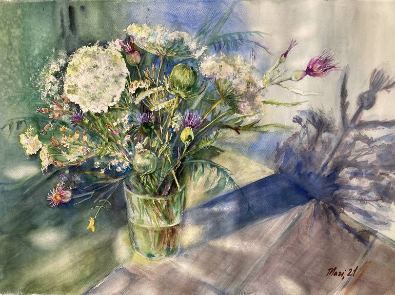 «Burnt by the sun». A bouquet of wildflowers is made in a raw watercolor technique.