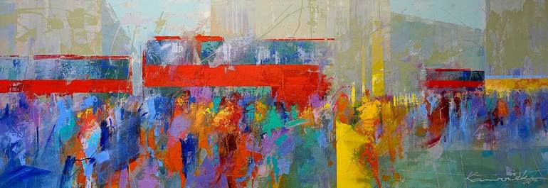 The painting "Busy London" is a dynamic scene showing a bustling city, captured in a large panoramic format 270x95 cm. The acrylic technique allows the use of intense, luminous colors and expressive texture, which gives the work depth and energy. In the foreground, a multi-colored crowd of passers-b...