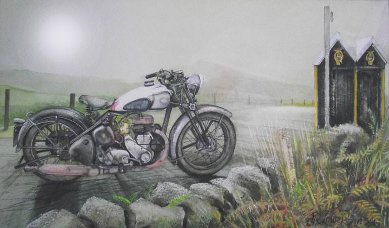 A signed original watercolour landscape, featuring a classic but weathered BSA M20 on a quiet country road in Late Autumn Hazy Sunshine