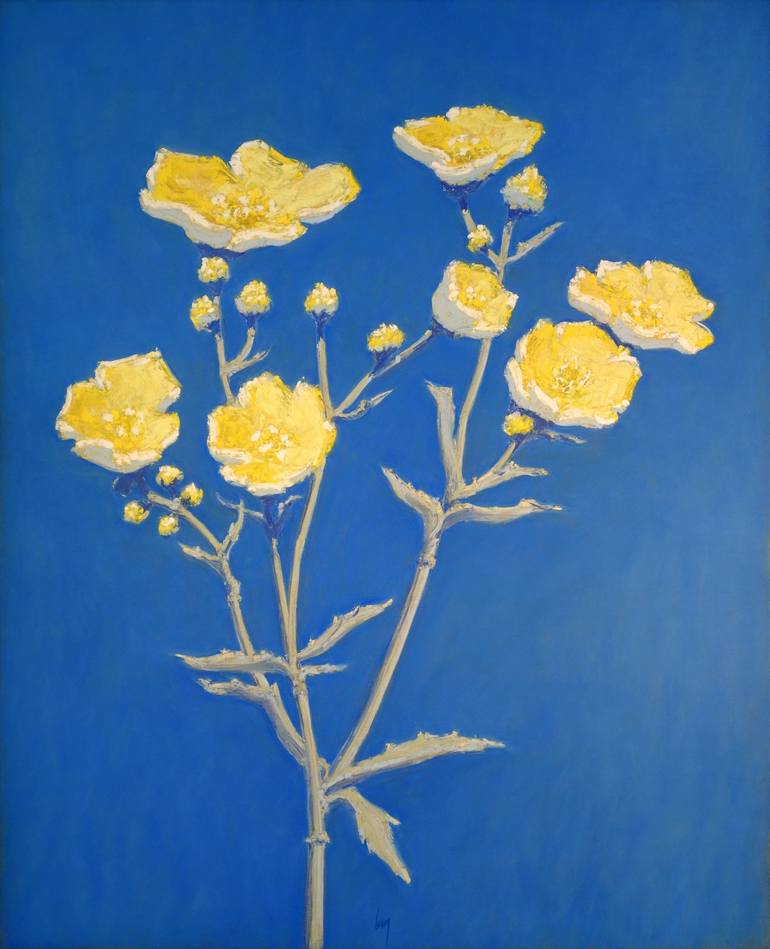 A buttercup plant by the side of a path. The vibrant flowers with their finely edged petals, the crowns of vibrant stamens in the sun, the buds just blooming, the beautiful supple stems punctuated with small leaves—a whole miniature and colorful festival that gives the path a festive air. The drawin...