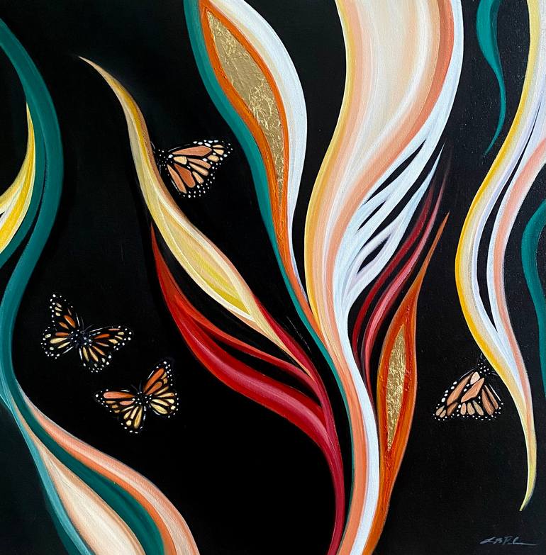 Like a monarch butterfly emerging from its chrysalis, this original oil painting on canvas, titled "Butterflies," embodies transformation and hope. Bright colors dance against a dramatic black backdrop, creating a dreamy and whimsical effect. The artist's abstract expressionism style captures the be...