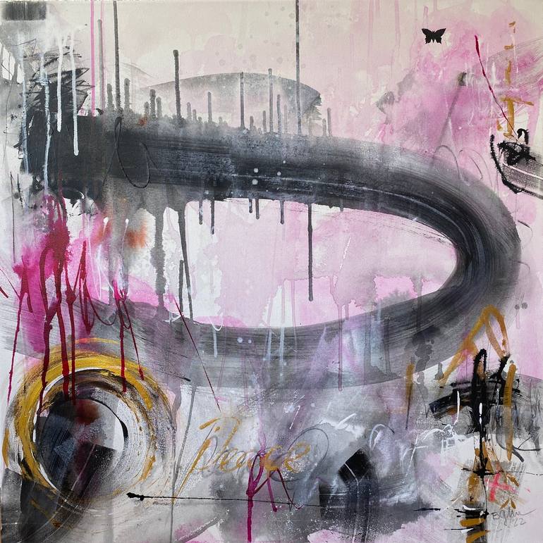 Acrylic, ink, neon color, neon pastels, pastels on Canvas. Butterfly No.11 #peace is a 80 cm/31.49 in H x 80 cm/31.49 in, 4 cm/1.5 in deep mixed media painting. Butterfly No.11 is inspired by Mariah Carey's song "Butterfly". When asked about where she got the inspiration for "Butterfly", Mariah sta...