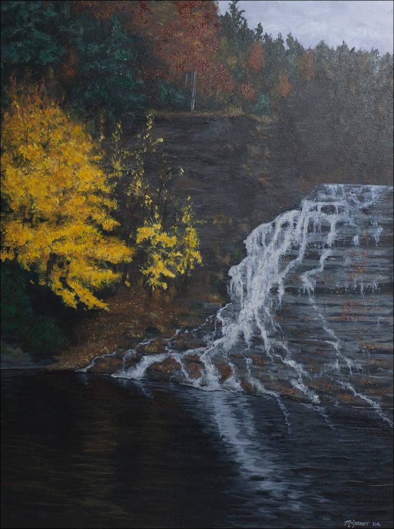 Buttermilk falls is an inspiration all in itself yet the bright colors of the leaves in stark contrast with the dark water is what caught my attention to the most. Please enjoy my painting thank you for looking.