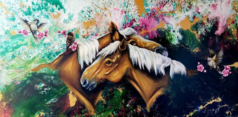 Two palamino horses scratch each other's necks while sparrows fly overhead. Jill was inspired by a very common yet beautiful activity that horses participate in, mutual grooming. The horses sit above a lush splattered background filled with greens, pinks and gold. The sparrows are sweet and full of ...