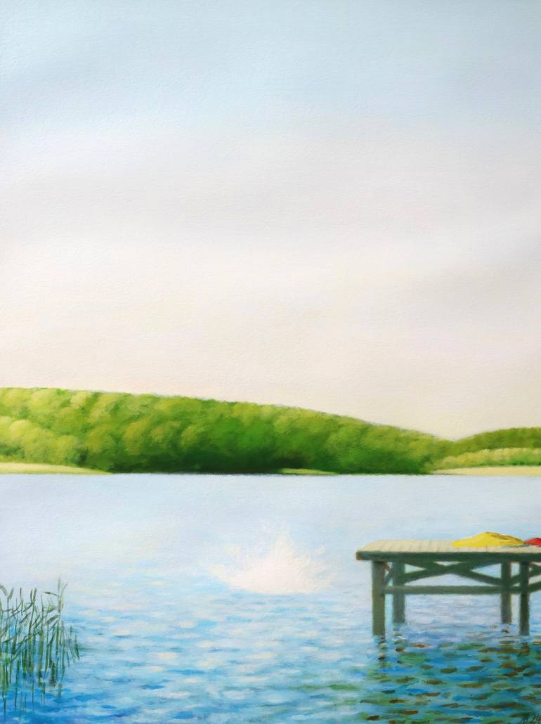 "By the lake" 24" X 18" acrylic/watercolor paper 2024. This painting is not framed. This painting was inspired by summer.